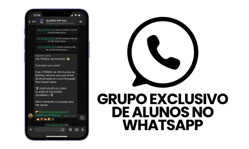 Você terá acesso ao nosso grupo exclusivo de alunos e será avisado das nossas aulas ao vivo, receberá materiais secretos e exclusivos que apenas alunos têm acesso e ficará conectado às novidades do Português Para Passar em primeira mão!
